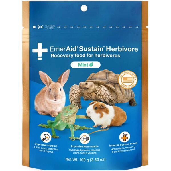 Sustain Herbivore is high-fiber, recovery nutrition for herbivores such as rabbits, guinea pigs, chinchillas, turtles, and iguanas. It is a nutritionally balanced formula that can be fed as a full meal.