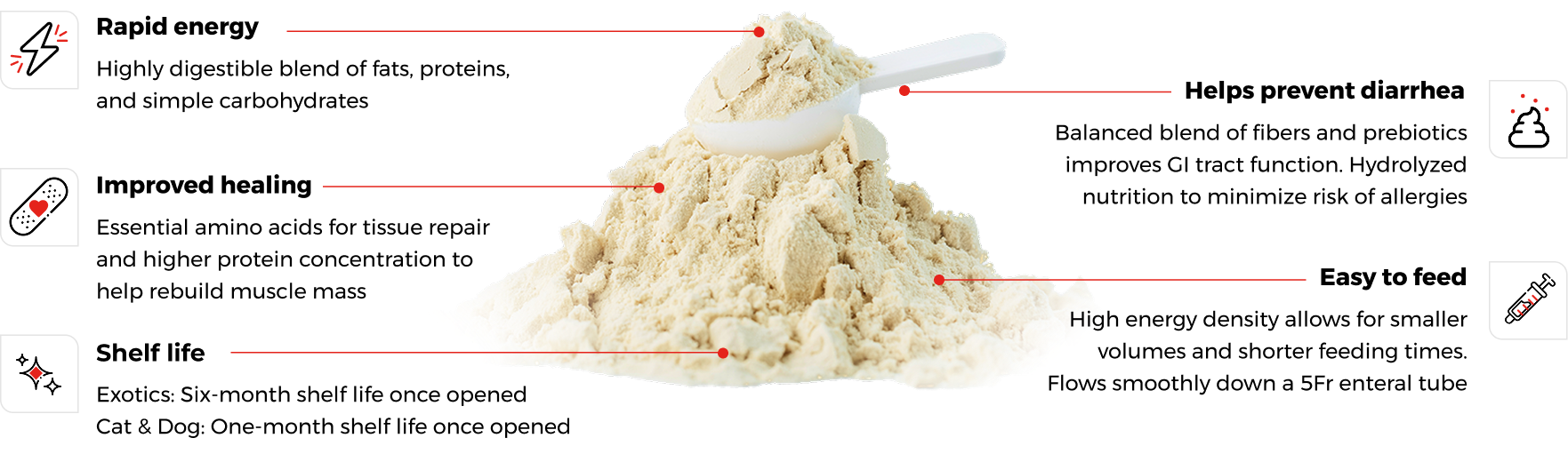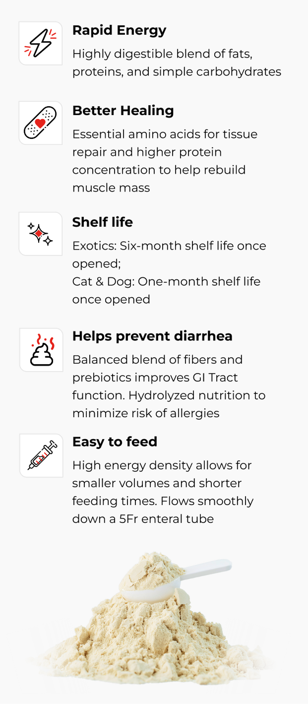 Higly digestible formula allow for sick animals to absorb nutrients more rapidly and efficiently.