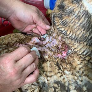 great horned owl being treatedWe anesthetized Sheridan with our new portable anesthesia machine (thank you DeKalb County Community Foundation for helping fund this and to the staff of the Wildlife Repair Shop for teaching us how to use it!) and started performing our makeshift surgery.